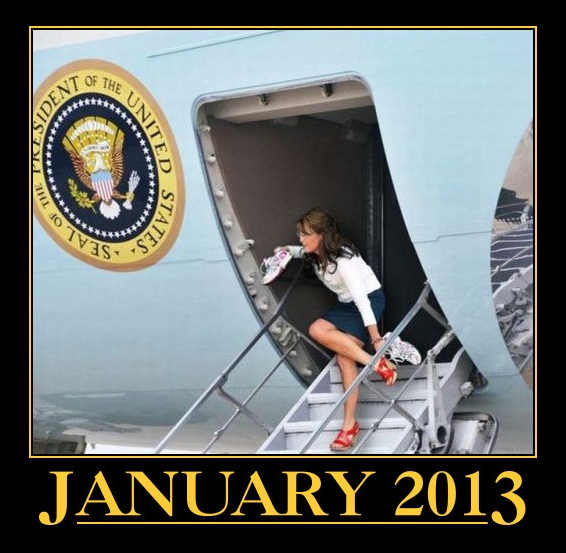 The photo above depicts our brand new President, Sarah Palin, departing Air Force One. She's removing her stylish heels and putting on her running shoes for the marathon she's about to run, as she Revives, Renews, and Restores America to greatness.